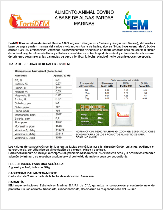 Alimento balanceado para ganado bovino, elaborado a base de algas pardas marinas del caribe mexicano en forma de harina, rico en “bioactivos esenciales”, ácidos grasos ω3 y ω6, aminoácidos, vitaminas, sales y minerales disponibles en forma orgánica para mejorar la nutrición del animal, regular el metabolismo y el balance osmótico en el tracto gastrointestinal y auto estimular el consumo del alimento para mejorar las ganancias de peso y fortificar la leche, principalmente durante épocas de sequía.