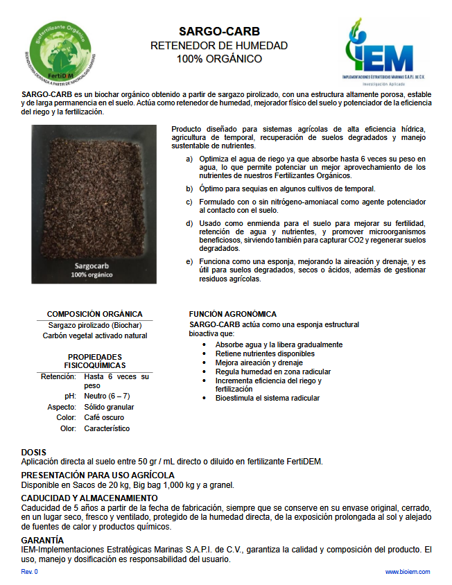 SARGO-CARB es un biochar orgánico obtenido a partir de sargazo pirolizado, con estructura altamente porosa y estable, diseñado para retener agua, conservar nutrientes y regenerar suelos, incrementando la eficiencia del riego y de la fertilización.
